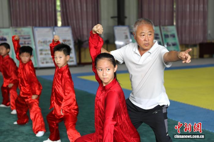 图为7月24日,武术老师在沧县吉庆学校武术馆指导学生武术动作。田博 摄