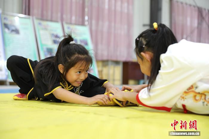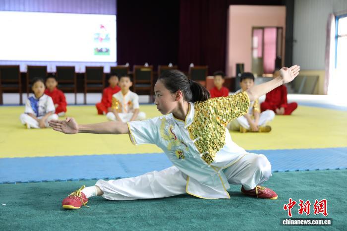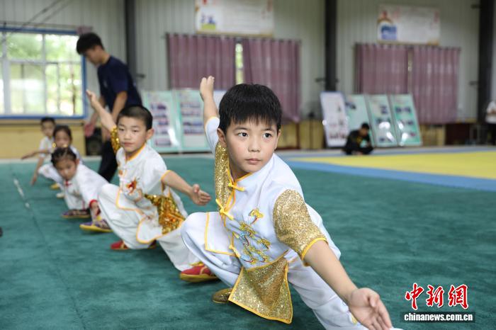 图为7月24日,学生在沧县吉庆学校武术馆演示武术套路。田博 摄