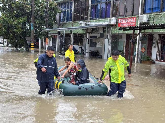 在齐腰深的积水中,村干部们拖着皮划艇艰难前行。村民章大伯家受灾尤为严重,其老伴告诉记者:“从凌晨开始家里就陆续进水,我们把所有电器都垫高了。到早上八九点,水越涨越高,赶紧让女儿打电话求助。”接到求助后,救援人员立即赶赴现场。
