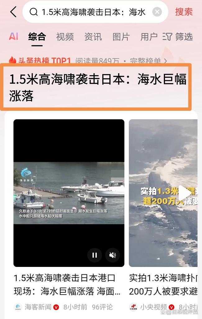 1.5米高海啸袭击日本港口现场曝光 海水疯狂涨落。日本沿海地区近日遭遇了一场1.5米高的海啸,海水剧烈涨落,造成了不小的混乱。7月30日,俄罗斯堪察加东岸远海发生了一次8.7级的强地震,引发了这场海啸。首波海啸在地震后2个多小时抵达了日本岩手县久慈港,浪高达到1.3米,随后北海道根室市观测到0.8米的浪高,宫城县石卷港也有0.7米。现场视频显示,原本平静的海面突然掀起巨浪,海水猛烈涌向岸边,港口的船只被冲得七零八落,许多设施也被淹没。