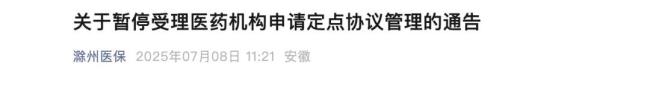 安徽省滁州医保局发布消息,自8月1日起,各级医保经办窗口暂停受理医疗机构和零售药店申请医保定点协议管理业务。待其市医保定点医药机构资源规划出台后,将依据相关规定另行通告。