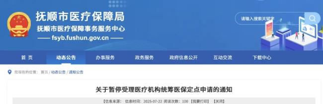 7月22日,辽宁省抚顺市医保局发布《关于暂停受理医疗机构统筹医保定点申请的通知》,暂停受理医疗机构城镇职工、城乡居民统筹医保定点申请。