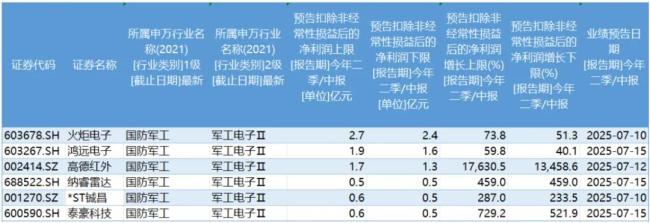参考申万行业分类2021,预计2025H1扣非净利润正增长且盈利的军工电子股有火炬电子、鸿远电子、高德红外(002414.SZ)、*ST铖昌、纳睿雷达(688522.SH)、泰豪科技(600590.SH)。