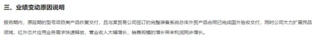 增长动能是原延期产品恢复交付且与贸易公司签订的完整装备系统总体合同已完成国外验收交付,同时公司大力扩展民品领域,红外芯片应用业务需求快速释放,销售规模的增长带来利润同步增长。