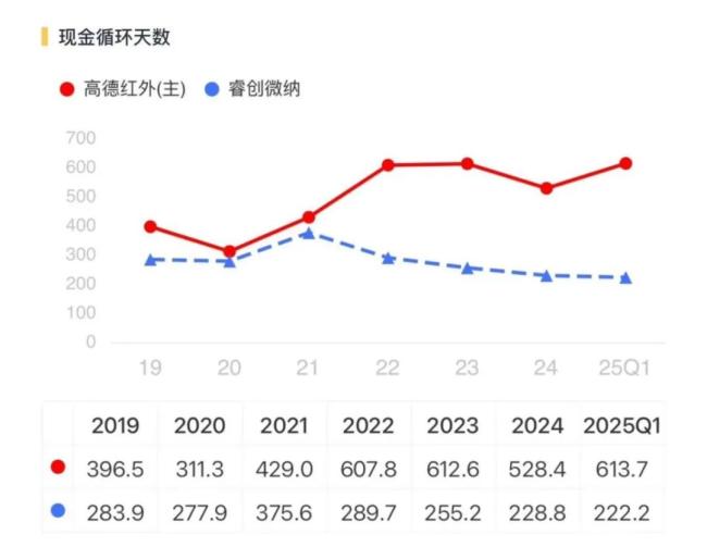值得担忧的是,高德红外常年缺乏自我造血能力,主要靠资本市场输血,现金循环天数高达500-600天,与同行相比业也是差了一截。