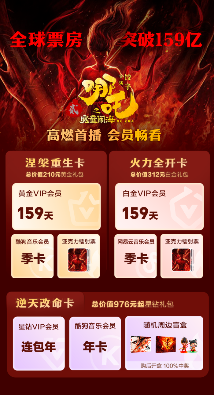 伴随《哪吒2》上线,爱奇艺重磅推出VIP会员卡定制礼包。“涅槃重生卡”,包含159天黄金VIP会员权益+酷狗音乐会员季卡+IP亚克力镭射票;“火力全开卡”,包含159天白金VIP会员权益+网易云音乐会员季卡+IP亚克力镭射票;“逆天改命卡”,包含星钻VIP会员连包年卡+酷狗音乐会员年卡+IP番外绘本/电影艺术设定集/泡泡玛特随机盲盒2个(以上随机3抽1)。从视听盛宴到实体周边,一次收获多重惊喜。