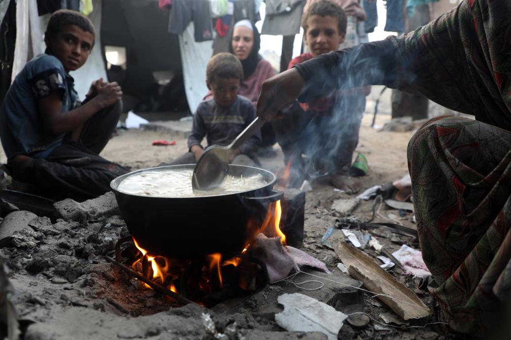 7月29日,在加沙城的一个帐篷里,孩子们在食物旁等待。新华社发(里泽克·阿卜杜勒贾瓦德摄)