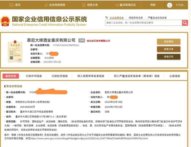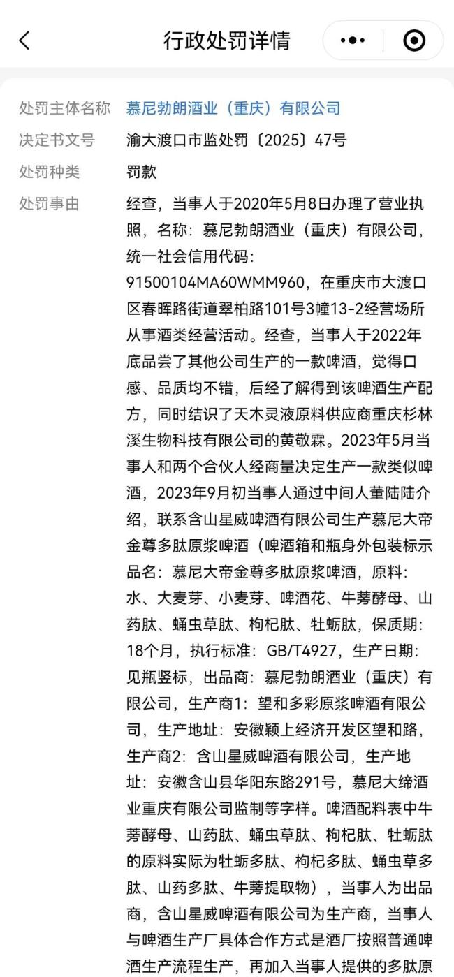 经查,涉案企业慕尼勃朗酒业(重庆)有限公司通过线上线下销售该款啤酒67箱。2025年2月,大渡口区市场监管局对违法企业作出没收产品及违法所得、罚款15万元的行政处罚,并将该企业及上游生产企业涉嫌犯罪线索一并移送公安机关依法追究其刑事责任。
