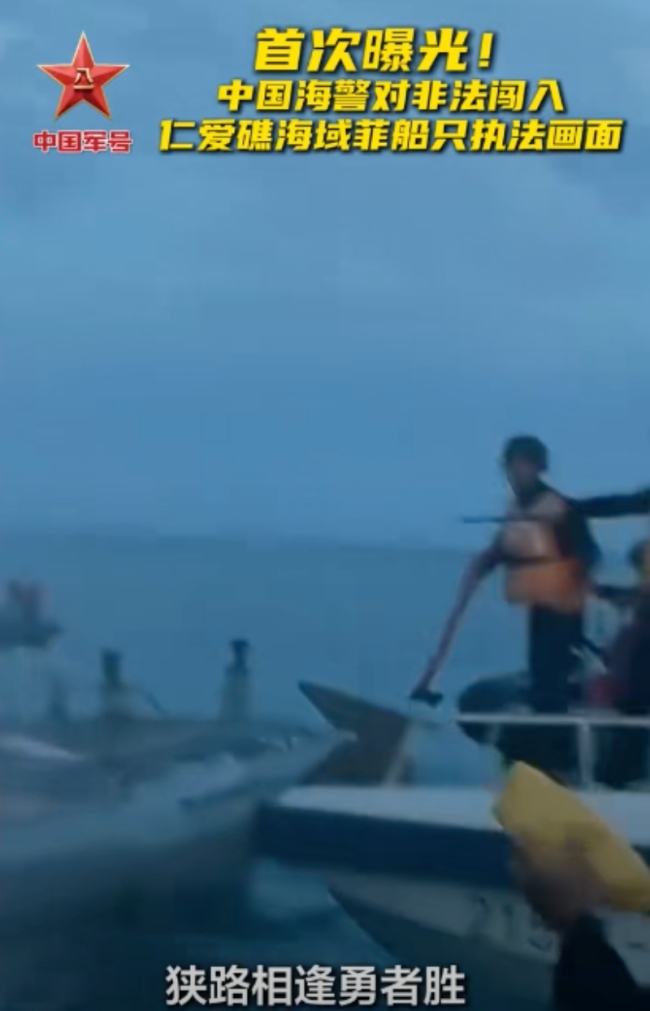 8月1日,中国海警对非法闯入仁爱礁海域的菲船只执法画面首次曝光。驱离现场,中国海警高喊“来来来!冲我来”