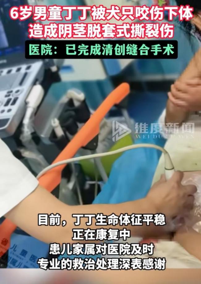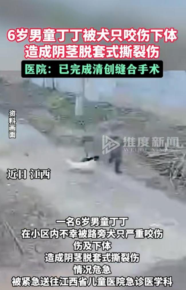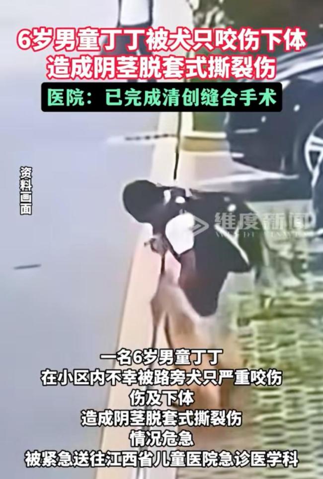 男童被犬只撕咬下体!江西一名六岁男童在小区内被一条未拴绳的狗攻击,导致下体严重受伤。江西省儿童医院的急诊科里弥漫着消毒水和绝望的气息。小男孩丁丁刚从手术室出来,他本该在小区里快乐玩耍,却因这条狗遭受了重创。医生诊断为阴茎脱套式撕裂伤,这不是简单的咬伤,而是酷刑。一个无忧无虑的童年被硬生生撕开了一道血淋淋的口子。
