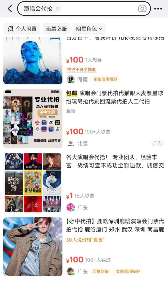 每到大型演出开票时,“代抢”服务在二手交易平台、票务黄牛群以及社交平台上十分活跃。在一些社交平台上,以“代抢门票”为关键词搜索,能发现大量相关信息,发布者多以个人账号为主,声称自己有“内部渠道”“专业团队”,保证高成功率,这些诱人的宣传语吸引力不少人。