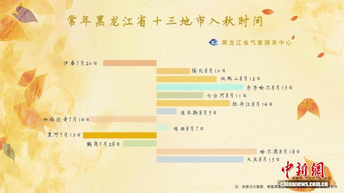 黑龙江省气象局统计数据显示,大兴安岭加格达奇区、黑河市、伊春市、鹤岗市一般在立秋到来前进入秋天,绥化市、双鸭山市、佳木斯市、七台河市、鸡西市常在“立秋首日”或后几日陆续入秋,齐齐哈尔市、大庆市、牡丹江市、哈尔滨市通常在8月14日至18日进入真正的秋季。(完)