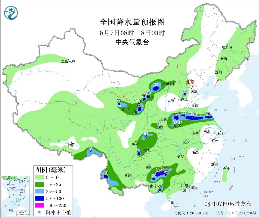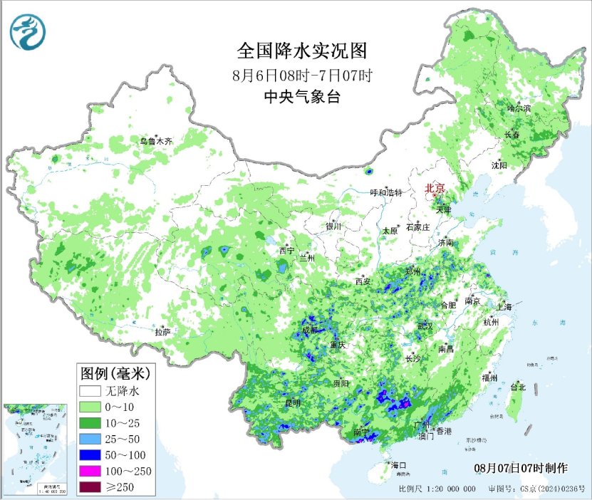 中新网8月7日电 据中央气象台网站消息,昨日,广东中东部、广西、云南、四川盆地、湖南南部、湖北、苏皖北部及河南中南部、山东南部、天津、北京东南部等地出现分散性大到暴雨,局地大暴雨,广西北海和防城港局地202~211毫米;河南周口局地最大小时降雨量超过120毫米。