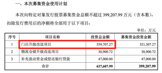 7月30日,永辉超市发布公告称,拟向特定对象发行A股股票,募集资金总额不超过39.92亿元,扣除发行费用后,净额将用于门店升级改造项目、物流仓储升级改造项目及补充流动资金或偿还银行贷款。上述三项目募集资金投资金额分别拟定为32.13亿元、3.09亿元、4.7亿元。