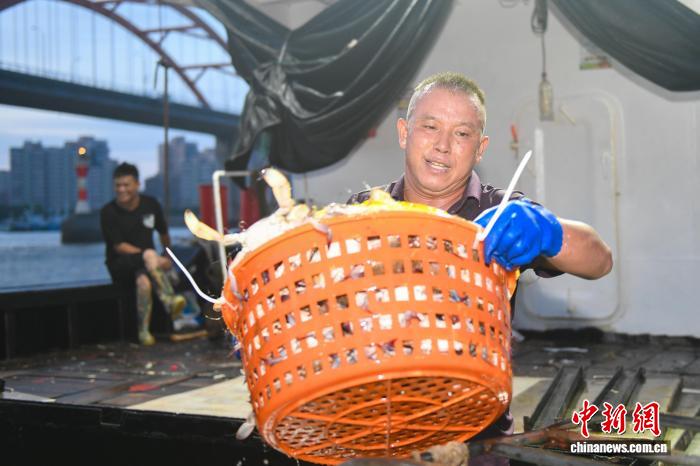 图为渔民将整筐梭子蟹从船舱中搬出。中新社发 姚凯乐 摄