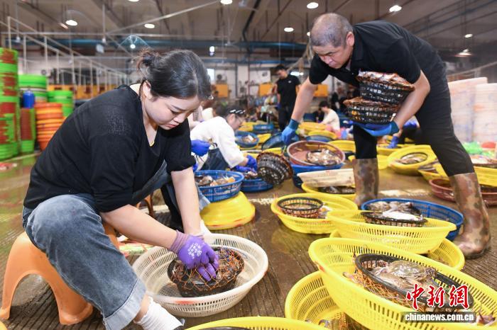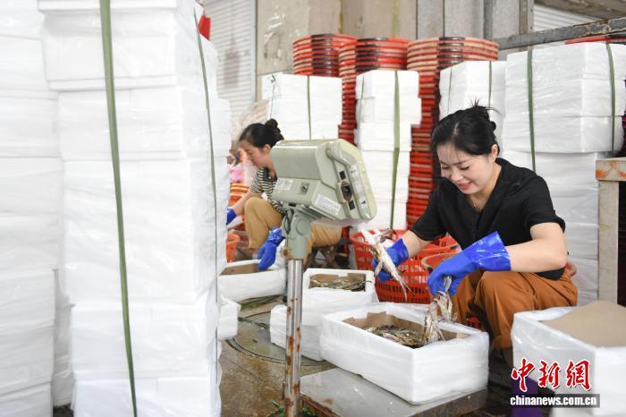 图为工作人员将梭子蟹打包。中新社发 姚凯乐 摄