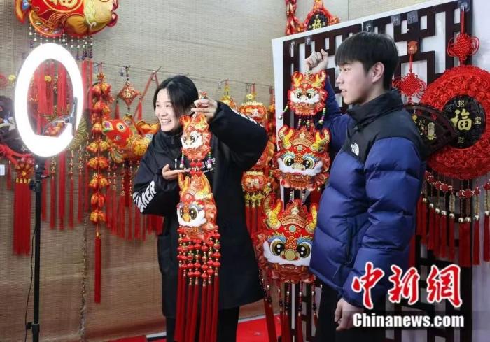临沂市郯城县返乡创业的青年正在直播售卖中国结。李结义 摄