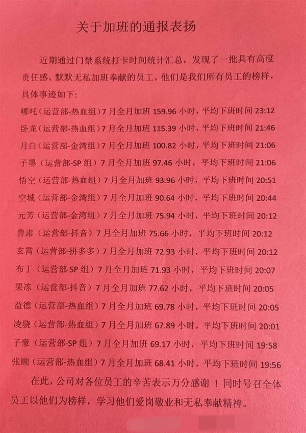 上海某公司通报加班表扬名单 引发网络热议!8月8日,有网友在社交平台上分享了一封来自上海某公司的加班表扬信。信中提到一位员工加班时长达到159.96小时,平均下班时间是晚上11点12分。公司对这些员工的辛勤付出表示感谢,并鼓励其他员工向他们学习,发扬爱岗敬业和无私奉献的精神。
