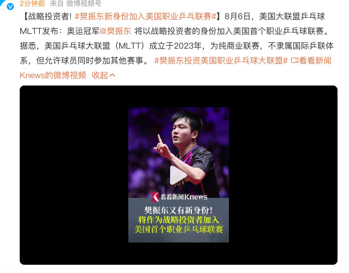 据媒体报道,最近美国乒乓球大联盟官方账号发布了一个重磅消息,奥运超级大满贯樊振东以战略投资者的身份参与到美国乒乓球大联盟的发展当中。这样一来也意味着樊振东是一个老板的身份,参与到这些球队的运作和发展里面,这是一个非常重磅的事情。有业内人士调侃,就相当于詹姆斯突然宣布要来中国投资CBA。