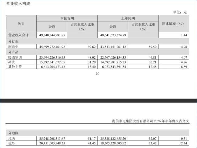 报告披露,2025年上半年,海信家电实现营收493.40亿元,同比仅增长1.44%;归母净利润20.77亿元,同比增长3.01%。