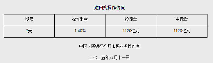 中新网8月11日电 据央行网站消息,2025年8月11日中国人民银行以固定利率、数量招标方式开展了1120亿元逆回购操作。具体情况如下: