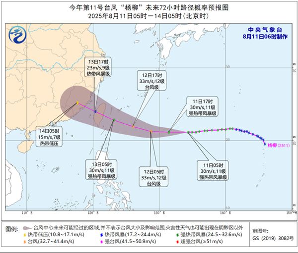中国天气网讯 据中央气象台消息,今年第11号台风“杨柳”(强热带风暴级)的中心今天(8月11日)早晨5点钟位于台湾花莲市东偏南方向大约1340公里的西北太平洋洋面上,就是北纬21.2度、东经134.3度,中心附近最大风力11级(30米/秒),中心最低气压980百帕,七级风圈半径为160~220公里,十级风圈半径为50~80公里。