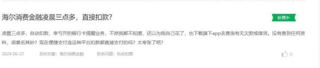 鳌头财经发现,类似莫名被扣费的投诉并非个例。一位消费者称,从来没在海尔消金借过款,2025年6月28日、7月28日,被海尔消金分别扣了257.18元。