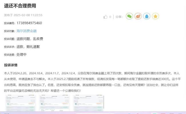 一位借款人投诉称,2024年在海尔消金借款4次,多次收取会员费。2025年2月7日提前结清了所有借款,结清后发现,每一笔额外收取了提前还款手续费近300元。