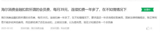 收费方面,海尔消金被投诉在不知情的情况下收取会员费、提前还款手续费等。