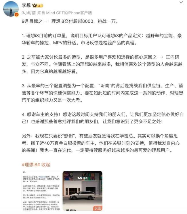 “市场反馈是检验产品的真理。”李想表示,理想i8目前的订单量,说明目标用户认可理想i8的产品定义:越野车的全能、豪华轿车的操控、MPV的舒适。虽然理想一直未公布i8的订单数据,但从李想的这一描述以及9月销量目标来看,i8目前收获的订单数据应该还是不错的。
