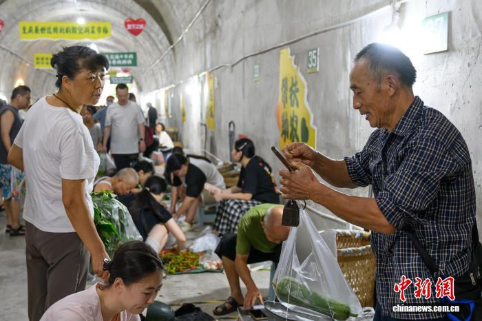 图为8月16日,市民在重庆渝北区的防空洞背篓菜市场选购蔬菜,该防空洞菜市场主要用来接驳重庆“背篓专线”,为菜农提供一个免费卖菜场地。 中新社记者 何蓬磊 摄