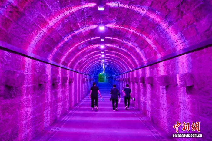 图为8月17日,游客从连接解放碑与洪崖洞的“洞见山城”防空洞走过。中新社记者 何蓬磊 摄