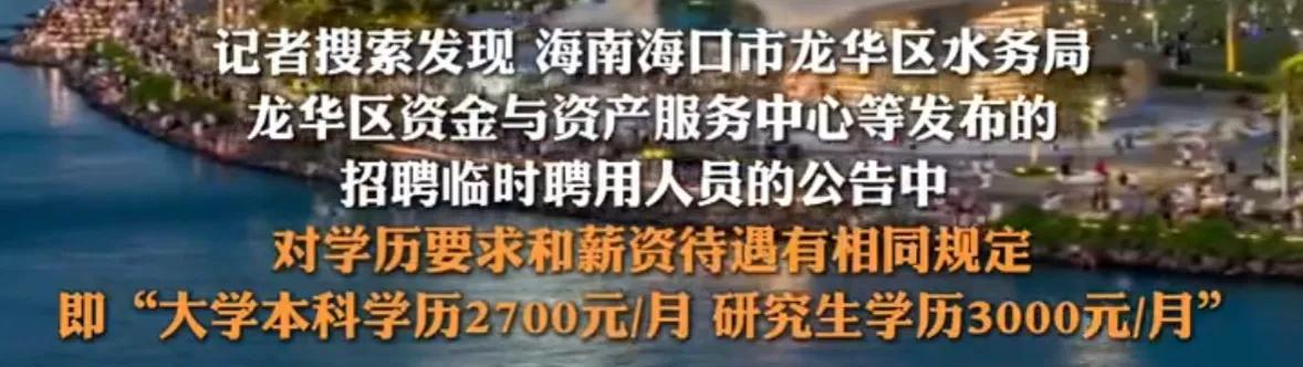 8月11日,海口市龙华区发展和改革委员会发布了《海口市龙华区发展和改革委员会关于2025年公开招聘临时聘用人员的公告》。公告中的月薪标准(含个人缴纳五险一金)为:大学本科学历2700元/月,研究生学历3000元/月。该薪资引发不少网友讨论。