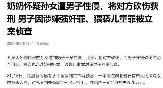 奶奶疑孙女遭性侵怒砍男子 情与法的碰撞。8月18日,中国裁判文书网披露了一起案件。湖北省石首市人民法院一审以故意杀人罪对孔某判处有期徒刑5年7个月,并赔偿王某经济损失近20万元。孔某因怀疑自己的孙女遭到邻居王某性侵,用菜刀将对方砍伤。两个月后,警方以涉嫌强奸罪、猥亵儿童罪对王某立案侦查。