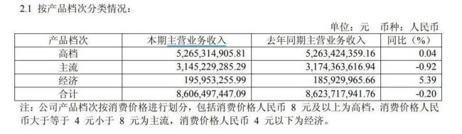 根据企业分类,价格8元及以上的产品为高档产品,4元到8元的产品为主流产品,4元以下的产品为经济型产品。财报显示,重庆啤酒上半年高档产品收入52.65亿元,同比增长0.04%;主流产品收入31.45亿元,同比下滑0.92%;经济型产品收入1.96亿元,同比增长5.39%。