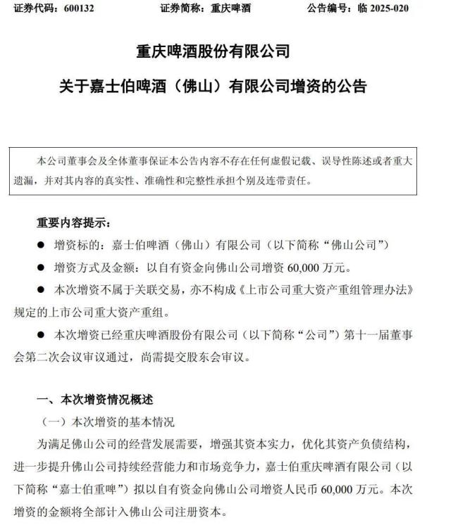 正是在南区业绩承压的背景下,半年报发布当日,重庆啤酒宣布嘉士伯重庆啤酒有限公司拟向嘉士伯啤酒(佛山)有限公司增资6亿元,称为满足佛山公司的经营发展需要,优化其资产负债结构,进一步提升佛山公司持续经营能力和市场竞争力。