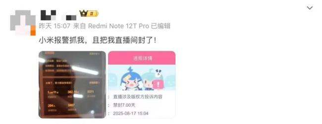 小米SU7Ultra挖孔事件还在持续发酵。8月17日,有小米SU7Ultra挖孔版维权车主(下称“车主”)发微博称,自己前往某小米SU7交付中心提车时,控诉交付主管报警抓自己。“小米报警抓我,且把我直播间封了!”该车主发帖,并附上一张直播被封的后台图片,图片显示违规原因是“直播涉及版权方投诉内容”。