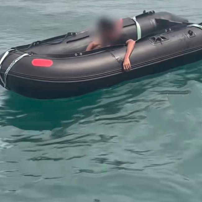 果然,橡皮艇外沿伸着一只脚。渔民呼唤了几声,艇内的男子疲惫地招了下手。渔民急忙扔过去绳子,但男子已经没有力气抓住。渔民只好把船靠上去,几个人合力把他抬到了渔船上。