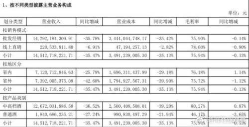 按产品类别划分,洋河股份中高档酒和普通酒同比分别下滑36.52%、27.24%;按销售模式划分,批发经销和线上直销同比分别下滑35.78%、6.91%;按地区划分,省内和省外同比分别下滑25.79%、42.68%。