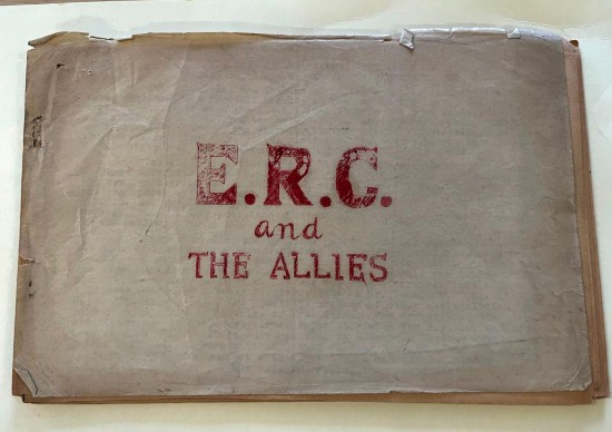 这是一本普通信纸大小、纸张泛黄发黑的笔记,封面用红字写着《东江纵队与盟军》。这份档案未经装订,只用别针夹着,页边已脆化。