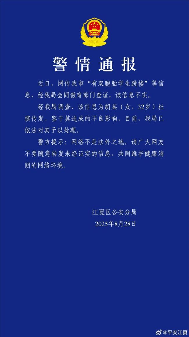 8月28日,湖北武汉警方发布警情通报称,近日网传武汉市“有双胞胎学生跳楼”的信息不实。经警方调查,该信息是由胡某(女,32岁)杜撰并传播的。鉴于其造成的不良影响,警方已依法对她进行了处理。