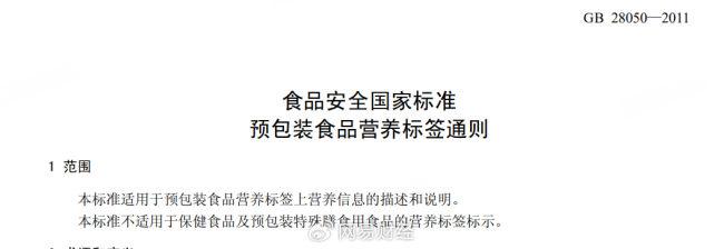 但事实是食品安全国家标准(GB28050 - 2011)全称为《食品安全国家标准—预包装食品营养标签通则》(GB 28050-2011),根据中华人民共和国国家卫生健康委员会官网信息显示,上述标准制定的目的是:“食品营养标签是向消费者提供食品营养信息和特性的说明,也是消费者直观了解食品营养组分、特征的有效方式。根据《食品安全法》有关规定,为指导和规范我国食品营养标签标示,引导消费者合理选择预包装食品,促进公众膳食营养平衡和身体健康,保护消费者知情权、选择权和监督权,原卫生部在参考国际食品法典委员会和国内外管理经验的基础上,组织制定了《预包装食品营养标签通则》(GB 28050-2011,以下简称“营养标签标准”),于2013年1月1日起正式实施”。