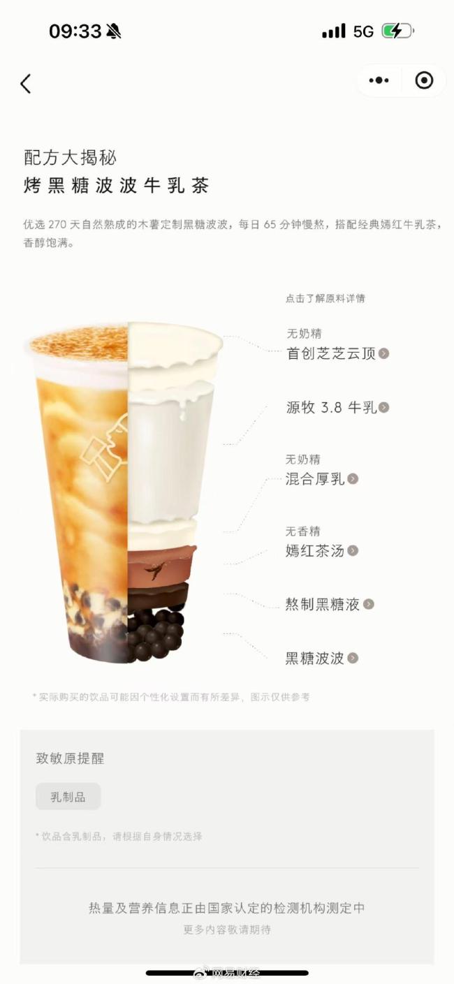但在喜茶小程序对于烤黑糖波波牛乳茶的描述中,图片显示,喜茶该产品配方包括“芝芝云顶”、“源牧3.8牛乳”、“混合厚乳”、“嫣红茶汤”、“熬制黑糖液”和“黑糖波波”。
