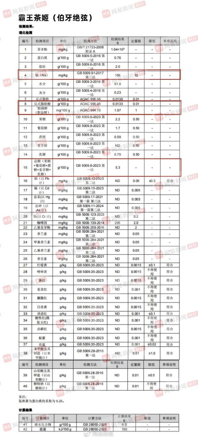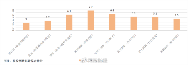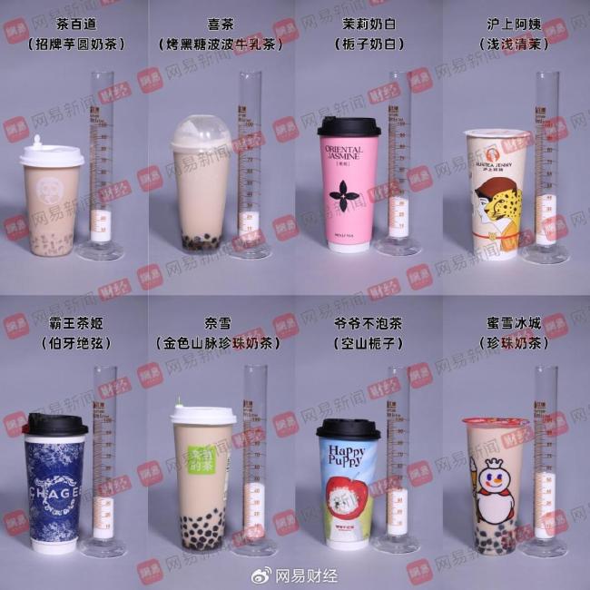 此次网易财经送检的奶茶品牌和产品分别为喜茶(烤黑糖波波牛乳茶)、奈雪(金色山脉珍珠奶茶)、蜜雪冰城(珍珠奶茶)、茉莉奶白(栀子奶白)、霸王茶姬(伯牙绝弦)、爷爷不泡茶(空山栀子)、沪上阿姨(浅浅清茉莉针王清乳茶)、茶百道(招牌芋圆奶茶)。