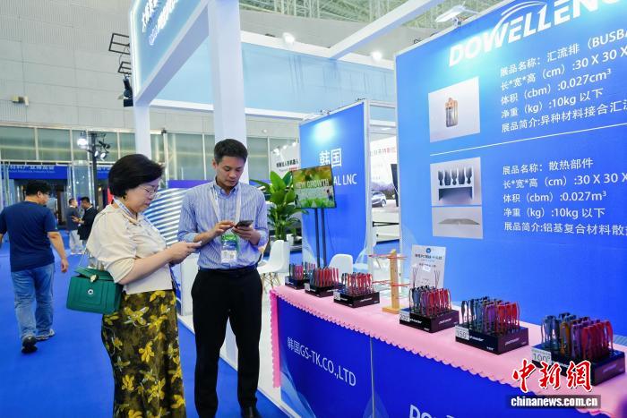 两名客商在一家韩国企业展台前洽谈业务。黑龙江省工业和信息化厅供图