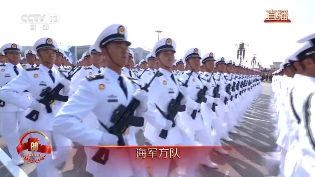 海军方队接受检阅。人民海军劈波斩浪,挺进深蓝,向海图强,全面提高海上威慑和实战能力,坚定维护海洋和平安宁,以崭新姿态加速向世界一流海军迈进。