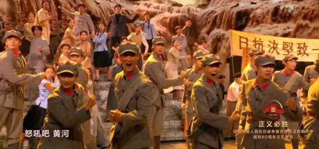 整场《正义必胜》演出犹如一部首尾呼应、结构完整的舞台史诗剧。创作思路不是以单个节目为导向,而是以情感、情绪为导向。当舞蹈《殇》呈现南京大屠杀的悲恸惨烈,社会各界用《祭黄帝陵文》凝聚起全民族抗战的决心时,《黄河大合唱》选段《怒吼吧,黄河》随之出现。这种安排使得情绪连贯,通过之前的表演自然过渡而来。
