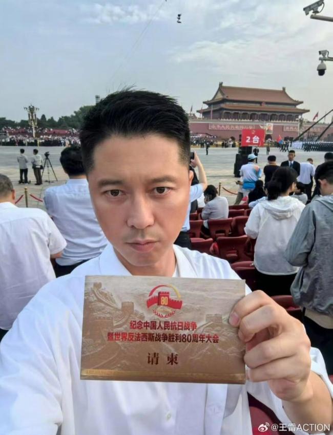 军人后代演员王雷晒观礼照片 致敬先辈与和平!9月3日,纪念中国人民抗日战争暨世界反法西斯战争胜利80周年大会在北京天安门广场隆重举行。演员王雷在微博上分享了自己现场观礼的照片,并配文:“今天的中国,就是那年先辈们心中的模样!正义必胜!和平必胜!人民必胜!”