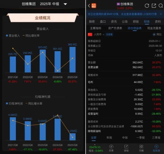 从创维集团(股票代码:00751.HK)2025年中期业绩报告可见:公司实现营收362.6亿元,同比增长20.3%,营收保持双位数增长;但股权持有人应占溢利(归母净利润)却同比大降67.4%,仅为1.25亿元,盈利能力正遭遇前所未有的挑战。