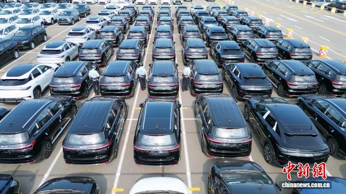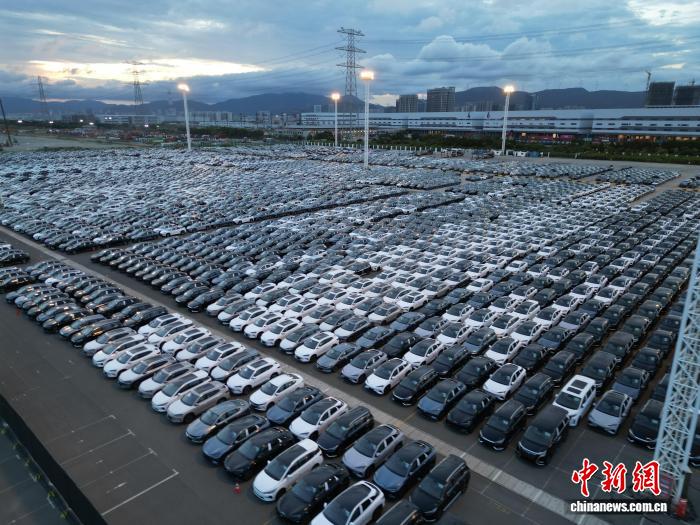 图为新能源汽车有序开上“比亚迪开拓者1号”轮,准备出口海外。(无人机拍摄)雷秉融 摄